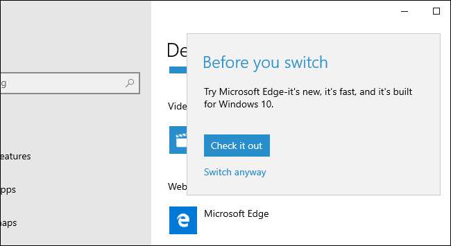 ونڈوز 10 کا یہ واحد پیغام نہیں ہے جو مائیکرو سافٹ ایج کو فروغ دیتا ہے۔ مثال کے طور پر ، آپ نے کروم یا فائر فاکس انسٹال کرنے کے بعد بھی ، ترتیبات کا ڈائیلاگ آپ کو پہلے سے ایج چیک کرنے کے کہے بغیر آپ کو یا تو اپنا ڈیفالٹ براؤزر نہیں بننے دے گا۔