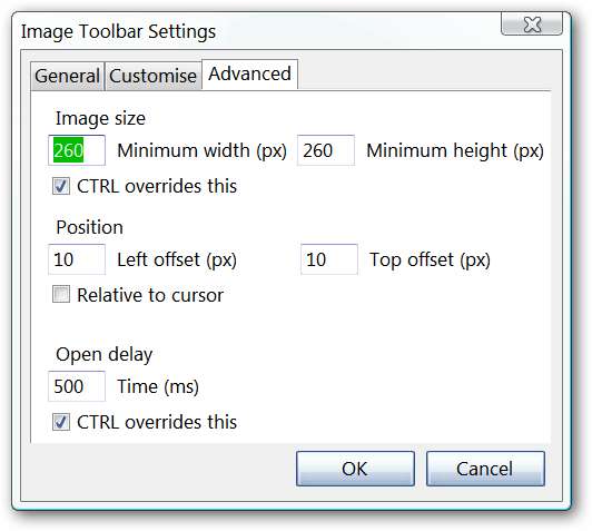 Như đã đề cập ở trên, kích thước hình ảnh mặc định cho thanh công cụ xuất hiện là “260 x 260 pixel”… chúng tôi đặt của chúng tôi là “10 x 10 pixel”. Nếu bạn muốn thanh công cụ xuất hiện liên quan đến con trỏ chuột của bạn thay vì góc trên bên trái của hình ảnh thì bạn có thể chọn thanh công cụ đó tại đây.