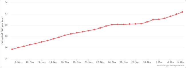 Hệ thống bằng chứng công việc của Bitcoin, yêu cầu người khai thác phải dành nhiều tài nguyên tính toán để xác minh giao dịch, chỉ ngày càng khó khăn hơn theo thời gian. Mạng được thiết kế để tạo ra một khối hợp lệ cứ sau 10 phút hoặc lâu hơn. Càng nhiều sức mạnh tính toán được ném vào nó, nó sẽ càng đòi hỏi nhiều hơn. Điều đó có nghĩa là việc sử dụng điện của Bitcoin sẽ không ngừng tăng lên, gây ra áp lực lớn đối với việc sử dụng năng lượng của thế giới.