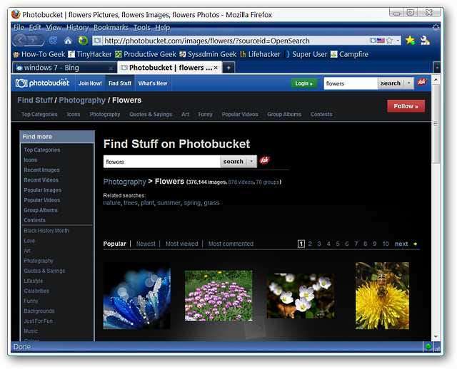 Ví dụ thứ hai của chúng tôi là tìm kiếm “Hoa” bằng công cụ tìm kiếm Photobucket của chúng tôi. Một lần nữa kết quả tốt đẹp đã mở ra trong một tab mới cho chúng tôi.