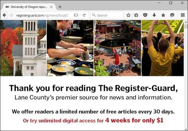 Một số trang web – bao gồm nhiều trang web báo chí – giới hạn cho bạn một số lượng nhỏ các bài báo miễn phí mỗi ngày, hàng tuần hoặc hàng tháng. Sau đó, họ yêu cầu bạn trả tiền cho một đăng ký trước khi đọc thêm.