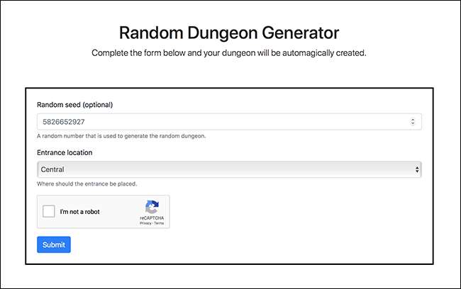 Đây không phải là một ứng dụng phức tạp: bạn chỉ cần cung cấp một chuỗi số ngẫu nhiên và vị trí của lối vào. Ứng dụng sẽ xuất ra một thiết kế ngục tối ngẫu nhiên, mà bạn có thể lấp đầy những cạm bẫy và cuộc gặp gỡ với nội dung trái tim của mình.