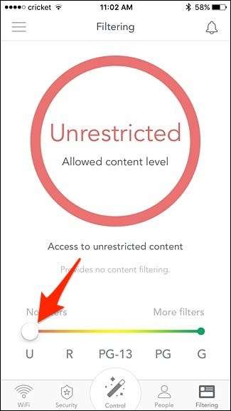 Theo mặc định, truy cập internet không bị hạn chế, nhưng bằng cách chạm và giữ vào vòng tròn màu trắng ở phía dưới và kéo nó đến mức ưu tiên, mạng Luma của bạn sẽ bắt đầu chặn các trang web và nội dung nhất định.