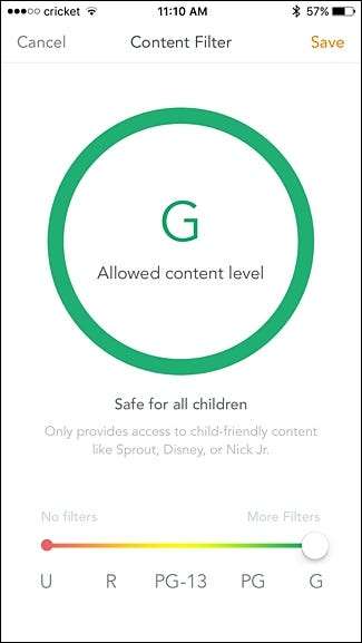 Tính năng kiểm soát của phụ huynh của Luma khá đơn giản và chỉ đi kèm với một tính năng lọc cơ bản cho phép bạn đặt quay số trên thang điểm được xếp hạng từ G đến R (giống như cách xếp hạng phim).