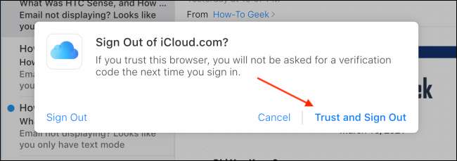Icloud Mail sẽ hỏi bạn liệu bạn có muốn tin tưởng trình duyệt này hay không. Tin tưởng một trình duyệt cho phép bạn đăng nhập vào thư iCloud mà không cần nhập mã xác minh. Nhấp vào nút "Tin tưởng và đăng xuất".