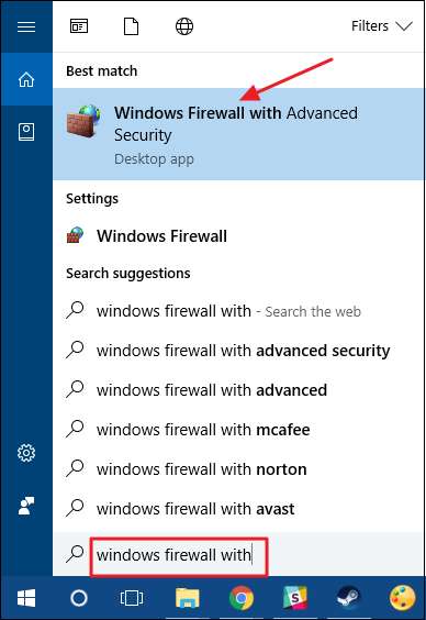 Mặc dù Command Prompt là cách nhanh nhất để thêm ngoại lệ vào tường lửa của bạn cho các yêu cầu ping, bạn cũng có thể thực hiện việc này trong giao diện đồ họa bằng ứng dụng “Tường lửa Windows với Bảo mật nâng cao”. Nhấn Bắt đầu, nhập “tường lửa cửa sổ với”, rồi khởi chạy “Tường lửa Windows với Bảo mật nâng cao”.