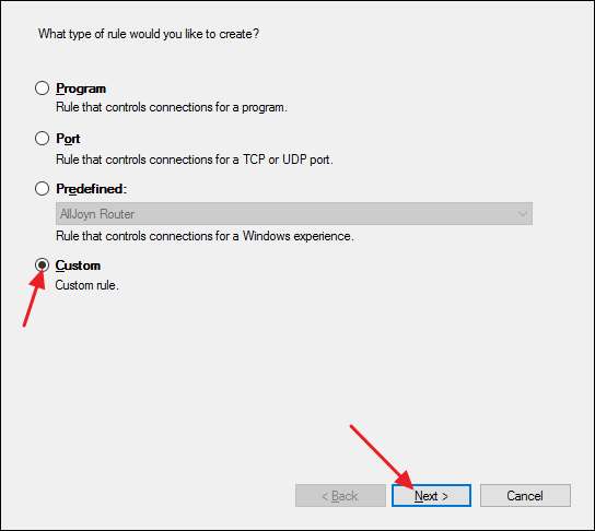 Trên trang tiếp theo, chọn “ICMPv4” từ menu thả xuống “Loại giao thức” và sau đó nhấp vào nút “Tùy chỉnh”.