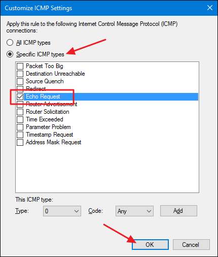 Trong cửa sổ “Tùy chỉnh cài đặt ICMP”, chọn tùy chọn “Loại ICMP cụ thể”. Trong danh sách các loại ICMP, hãy bật “Yêu cầu tiếng vang” và sau đó nhấp vào “OK”.