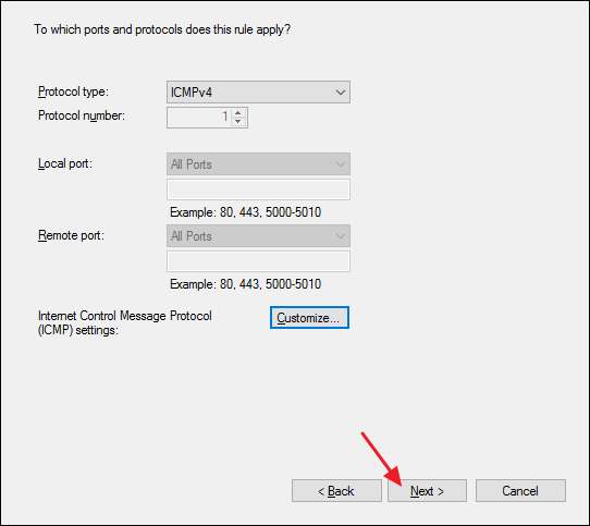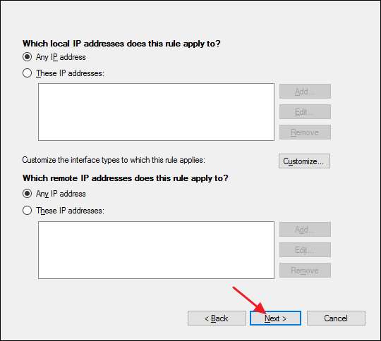 Trên trang tiếp theo, đơn giản nhất là chỉ cần đảm bảo rằng các tùy chọn "Địa chỉ IP bất kỳ" được chọn cho cả địa chỉ IP cục bộ và địa chỉ IP từ xa. Nếu muốn, bạn có thể định cấu hình các địa chỉ IP cụ thể mà PC của bạn sẽ phản hồi yêu cầu ping. Các yêu cầu ping khác bị bỏ qua. Điều này cho phép bạn thu hẹp mọi thứ lại một chút để chỉ một số thiết bị nhất định mới có thể ping PC của bạn. Bạn cũng có thể định cấu hình danh sách riêng các địa chỉ IP được chấp thuận cho mạng cục bộ và mạng từ xa (Internet) của mình. Tuy nhiên, bạn đã thiết lập nó, hãy nhấp vào “Tiếp theo” khi bạn hoàn tất.