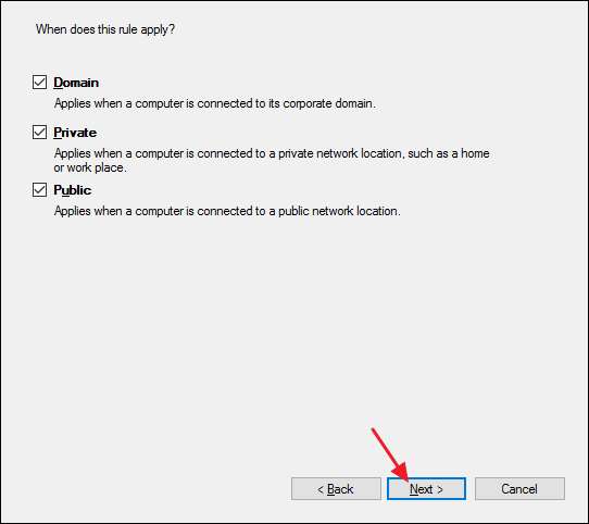 Trang tiếp theo cho phép bạn kiểm soát thời điểm quy tắc đang hoạt động. Nếu bạn muốn áp dụng quy tắc cho dù nó được kết nối với loại mạng nào, hãy để các tùy chọn ở chế độ mặc định và chỉ cần nhấp vào “Tiếp theo”. Tuy nhiên, nếu PC của bạn không phải là một phần của doanh nghiệp (và không kết nối với miền) hoặc nếu bạn không muốn nó phản hồi các yêu cầu ping khi nó được kết nối với mạng công cộng, vui lòng tắt các tùy chọn đó.