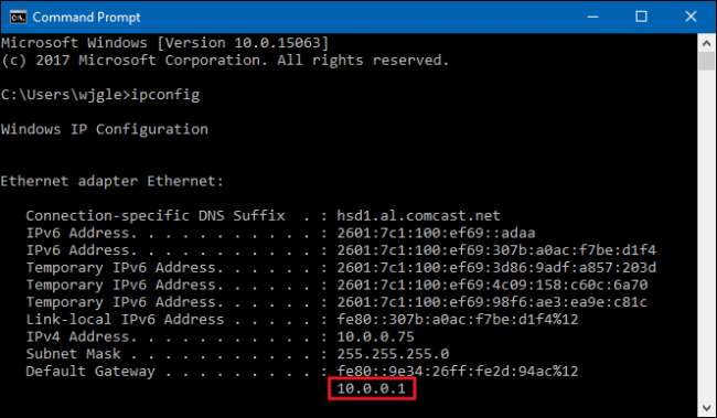 và nhấn Enter. Trong kết quả, hãy tìm phần hiển thị kết nối mạng hiện tại của bạn. Địa chỉ IP của bộ định tuyến được hiển thị ở bên phải mục nhập "Cổng mặc định".
