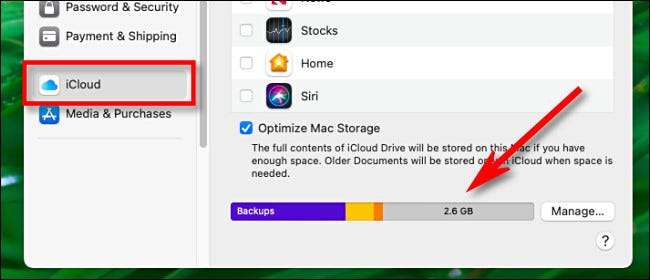 Trên màn hình "ID Apple", nhấp vào "iCloud" trong thanh bên. Bạn sẽ thấy lưu trữ có sẵn của mình được liệt kê trong biểu đồ thanh ở cuối danh sách ứng dụng.