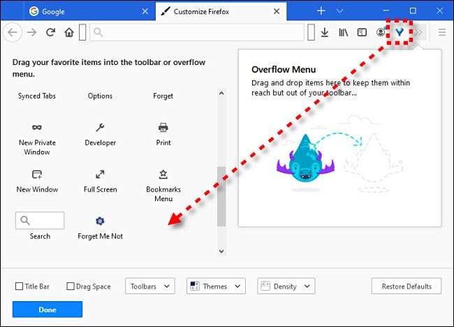 Trong tab "Tùy chỉnh Firefox", bạn sẽ thấy một danh sách các mục có thể được kéo vào thanh công cụ. Bạn cũng có thể kéo các mục từ thanh công cụ vào danh sách đó, xóa chúng khỏi thanh công cụ.