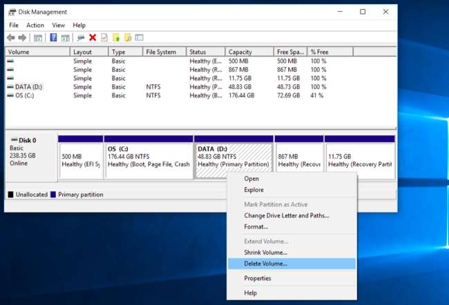 Trước tiên, chúng ta sẽ bắt đầu bằng cách xóa một trong các phân vùng. Nếu bạn có một PC mới với một phân vùng chứa các tệp hệ thống của bạn và một phân vùng trống có nhãn “DATA” hoặc thứ gì đó tương tự, chúng tôi sẽ xóa phân vùng trống đó.