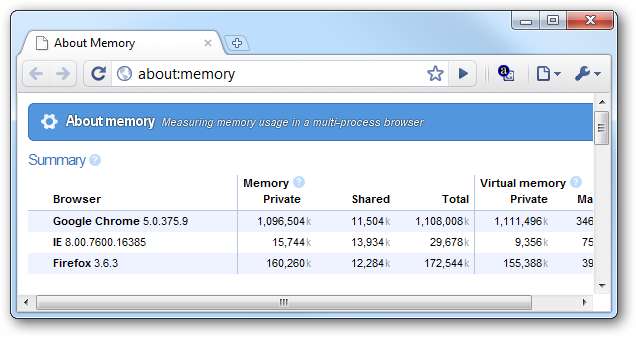 Thay vì lấy ra một máy tính và cộng tất cả chúng lại, bạn chỉ có thể mở Google Chrome và nhập about: memory vào thanh vị trí để xem danh sách đầy đủ về việc sử dụng bộ nhớ của từng trình duyệt.