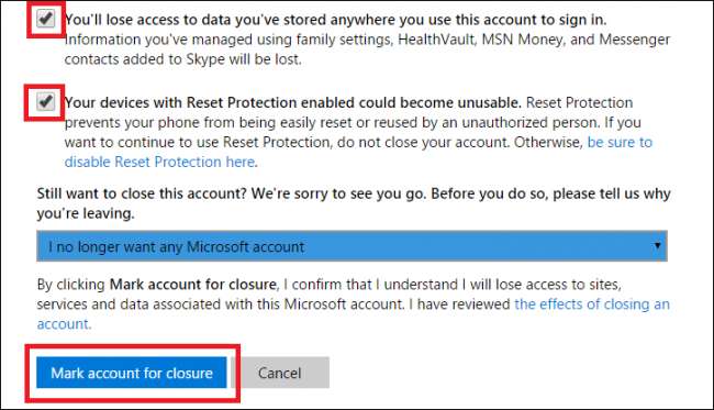 Sau khi bạn nhấp qua tất cả những điều này, Microsoft sẽ hỏi lý do bạn chọn xóa tài khoản. Đưa ra lý do và nhấp vào “Đánh dấu tài khoản để đóng”.