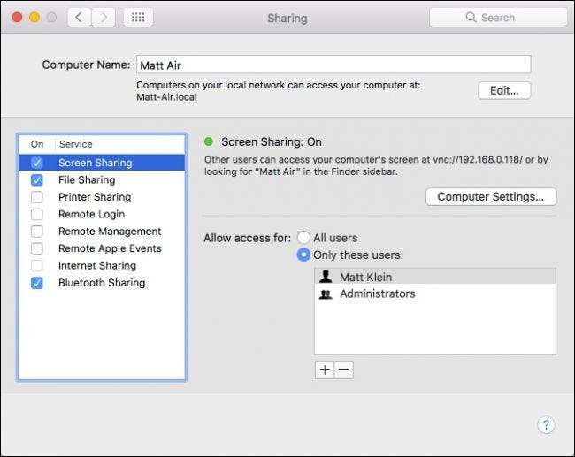 Khi mở tùy chọn Chia sẻ, hãy chọn hộp bên cạnh dịch vụ Chia sẻ màn hình. Với dịch vụ hiện được bật, bạn có thể giới hạn quyền truy cập cho một số người dùng nhất định hoặc mở nó cho bất kỳ ai, mặc dù họ sẽ không thể thực sự đăng nhập vào máy Mac của bạn mà không có tài khoản người dùng.