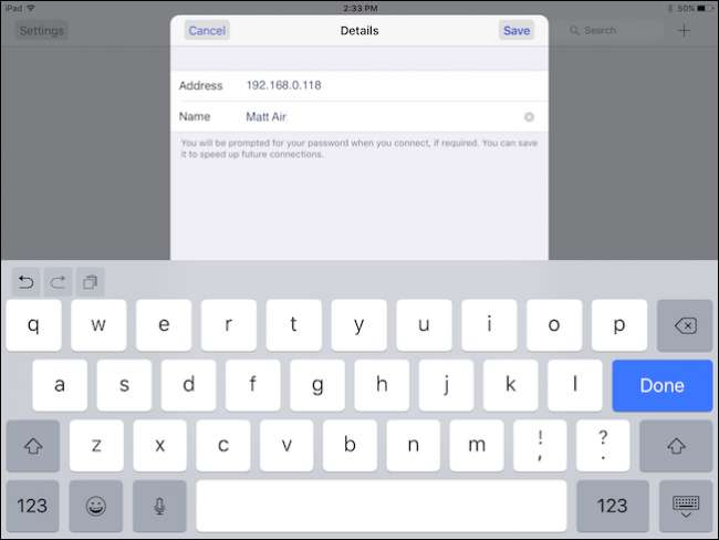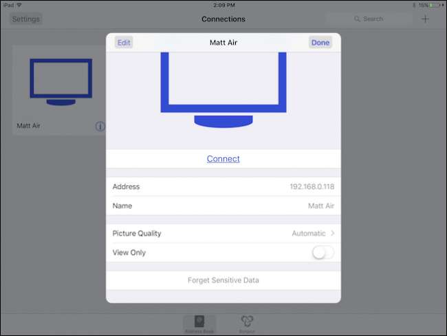 Nhớ IP của máy Mac của chúng tôi? Bạn muốn nhập số đó vào trường Địa chỉ. Chúng tôi đã đặt tên cho kết nối của mình giống như tên của máy tính, nhưng bạn có thể đặt tên cho kết nối của mình bất kỳ tên nào bạn muốn.
