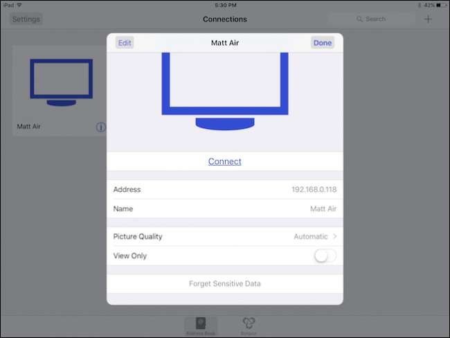 Ở đây có các tùy chọn để điều chỉnh chất lượng hình ảnh tùy thuộc vào tốc độ kết nối của bạn và buộc nó ở chế độ “Chỉ xem”. Nếu bạn muốn xóa mật khẩu của kết nối, hãy nhấn vào “Quên dữ liệu nhạy cảm”.