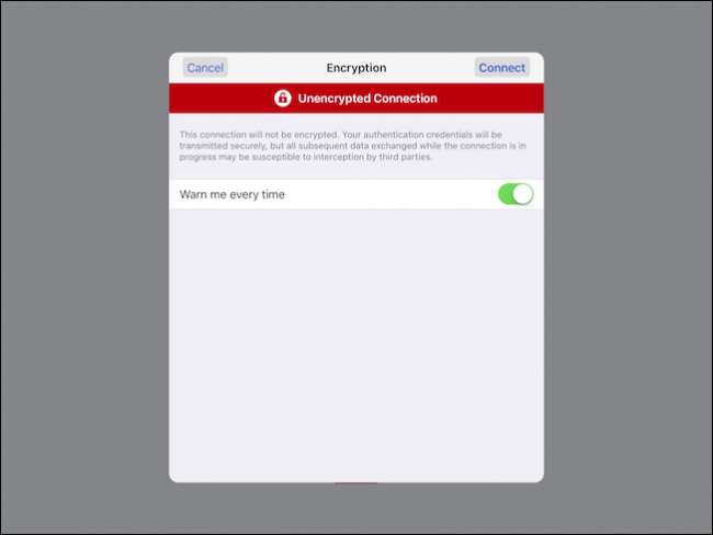 Để thực sự kết nối với máy Mac của bạn, hãy nhấn vào kết nối trong màn hình VNC Viewer. Bạn sẽ được cảnh báo rằng kết nối của bạn không được mã hóa và bạn sẽ có tùy chọn được cảnh báo mỗi khi kết nối. Hãy tiếp tục và nhấn vào “Kết nối” để bắt đầu.