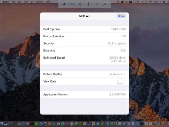 Làm tròn các nút trên thanh điều khiển, biểu tượng dấu chấm hỏi sẽ hiển thị màn hình trợ giúp mà chúng tôi đã cho bạn xem trước đó và dấu “X” sẽ ngắt kết nối phiên. Nhấn vào biểu tượng “i” sẽ hiển thị thông tin về kết nối của bạn. Từ đó, bạn cũng có thể thay đổi chất lượng hình ảnh nếu kết nối của bạn quá chậm và bạn cũng có thể chuyển đổi phiên thành chỉ xem.