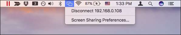 Lưu ý rằng trong khi một thiết bị khác được kết nối với máy Mac của bạn, bạn có thể ngắt kết nối chúng bằng cách nhấp vào biểu tượng chia sẻ màn hình trong thanh menu và chọn tùy chọn ngắt kết nối từ menu thả xuống.