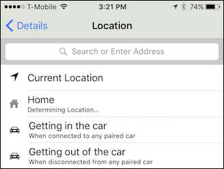 Tiếp theo, nhấp vào “Tại một vị trí” và bạn sẽ thấy danh sách thả xuống cho phép bạn chọn vị trí hiện tại, nhà riêng của mình hoặc ra vào bất kỳ ô tô nào mà thiết bị đó được ghép nối.