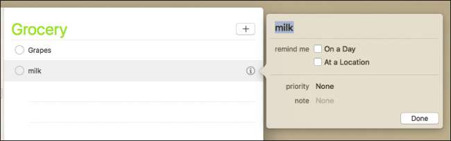 Bạn cũng có thể tạo lời nhắc trên máy Mac của mình, vì nó sẽ đồng bộ liền mạch với các thiết bị khác của bạn miễn là nó được thiết lập thông qua iCloud. Nhấp vào chữ “i” nhỏ bên cạnh mục và menu tùy chọn sẽ hiện ra.