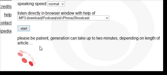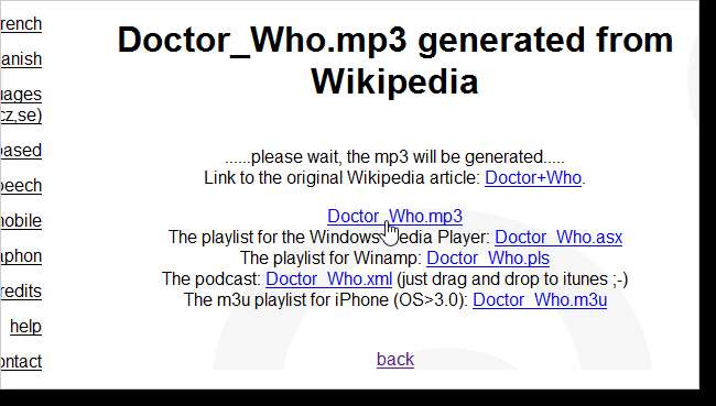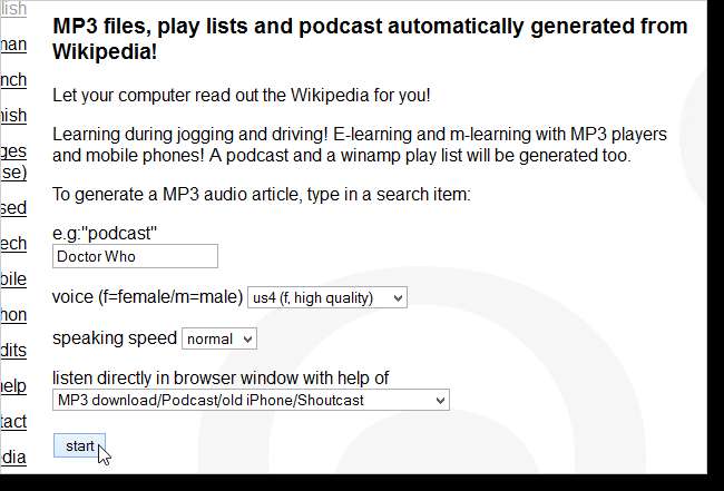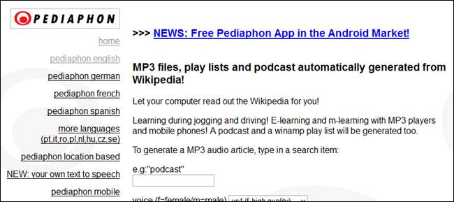 Để tạo tệp MP3 từ một bài viết trên Wikipedia, hãy truy cập http://www.pediaphon.org/~bischoff/radiopedia/index_en.html . Nhập cụm từ tìm kiếm cho bài viết bạn muốn chuyển đổi vào hộp chỉnh sửa bên dưới, ví dụ: "tệp âm thanh".