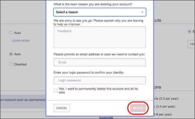Một cửa sổ sẽ bật lên với một trường văn bản để giải thích lý do tại sao bạn rời khỏi, một trường cho một địa chỉ email mà bạn có thể để trong trường hợp protonmail cần liên hệ với bạn và trường mật khẩu để xác minh quyết định của bạn.