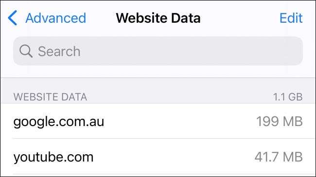 Khởi chạy cài đặt và nhấn vào Safari & GT; Nâng cao & GT; Dữ liệu trang web. Menu này có thể mất một chút thời gian để tải dưới dạng Safari tìm nạp danh sách đầy đủ dữ liệu trang web và ước tính bao nhiêu lưu trữ mỗi mục nhập trên thiết bị của bạn.