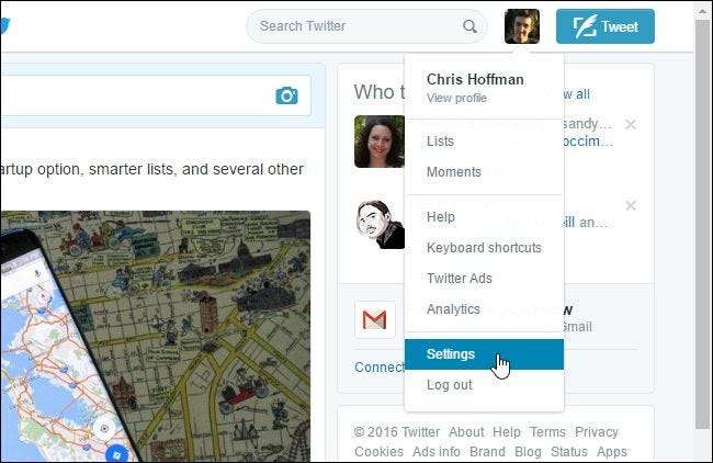 Để xóa tài khoản của bạn, hãy truy cập trang web Twitter trong trình duyệt web của bạn — bạn không thể sử dụng ứng dụng trên điện thoại thông minh — và đăng nhập vào tài khoản của bạn. Nhấp vào ảnh tài khoản người dùng của bạn và chọn “Cài đặt” để truy cập trang cài đặt tài khoản của bạn.