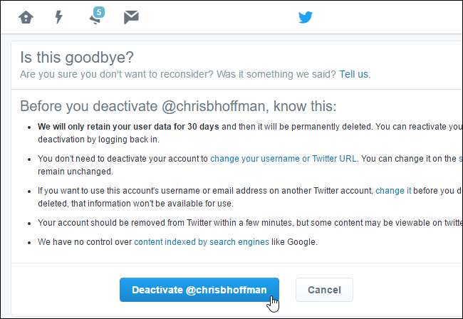 Để xóa tài khoản của bạn, trước tiên bạn phải "hủy kích hoạt" nó. Khi bạn hủy kích hoạt tài khoản của mình, Twitter sẽ xóa dữ liệu của bạn khỏi Twitter trong vòng vài phút. Sau đó, tài khoản của bạn sẽ được xếp vào hàng đợi xóa vĩnh viễn. Sau 30 ngày, Twitter sẽ trở thành quá trình xóa vĩnh viễn tài khoản của bạn và dữ liệu liên quan. Dữ liệu của bạn sau đó sẽ bị xóa vĩnh viễn và bất kỳ ai cũng có thể đăng ký tài khoản mới bằng tên người dùng Twitter cũ của bạn.