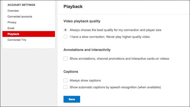 Lưu ý, bạn cũng có thể bật phụ đề tại đây, vì vậy bạn không phải bật phụ đề theo cách thủ công từ cài đặt video. Ngoài ra còn có tùy chọn “chất lượng phát lại video”, vì vậy bạn có thể chỉ định xem YouTube có nên phân phát luồng video chất lượng tốt nhất theo kết nối và kích thước trình phát của bạn hay không hoặc bạn có thể yêu cầu YouTube không bao giờ phát video chất lượng cao.