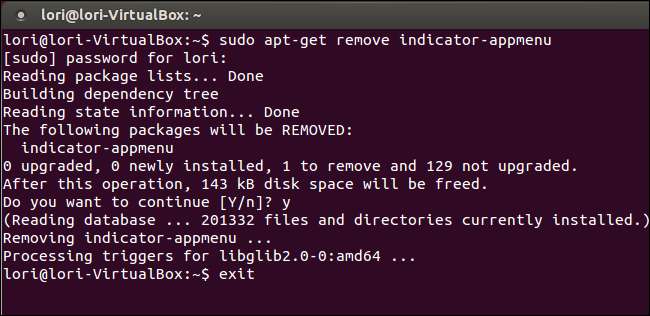 Gói được gỡ bỏ và bạn được quay lại lời nhắc. Để đóng cửa sổ Terminal, gõ “exit” và nhấn Enter.