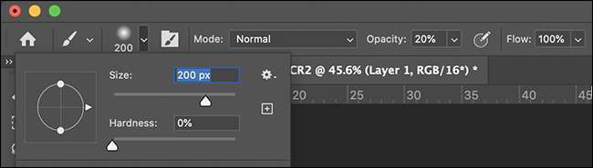 Trong thanh menu, cấu hình bàn chải. Bạn có thể bắt đầu với các cài đặt tương tự cho phương thức đầu tiên. Một cái gì đó như A. Kích thước từ 50px đến 250px, một Độ cứng 0%, một Opacity. 20%, và một Chảy 100%.