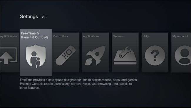 Điểm dừng đầu tiên là menu cài đặt. Trong danh sách điều hướng bên trái trên thiết bị Fire của bạn, hãy cuộn xuống mục nhập “Cài đặt” và sau đó điều hướng sang phải trên hệ thống menu cho đến khi bạn đến “FreeTime & Parental Controls”.