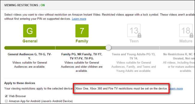 Trên thực tế, kludgy có lẽ là một cách nói hào phóng vì chúng tôi đã rất thất vọng về yếu tố này của trải nghiệm kiểm soát của cha mẹ. Nếu bạn đã sử dụng bảng điều khiển Amazon Instant Video trên trang web Amazon để thiết lập mã pin của mình, bạn có thể nhận thấy phần này ngay bên dưới phần tạo mã PIN: