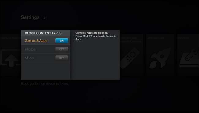 Bạn có thể khóa danh mục Trò chơi & Ứng dụng cũng như các danh mục Ảnh và Nhạc để người dùng không thể truy cập bất kỳ trò chơi, ứng dụng, ảnh hoặc nhạc nào từ menu Fire TV chính mà không có mã PIN.