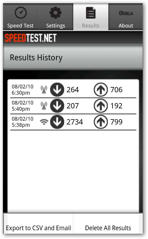 Bằng cách chọn nút menu trên thiết bị của bạn khi đang ở trên màn hình Kết quả, bạn có thể xóa lịch sử hoặc xuất kết quả dưới dạng giá trị được phân tách bằng dấu phẩy qua email.