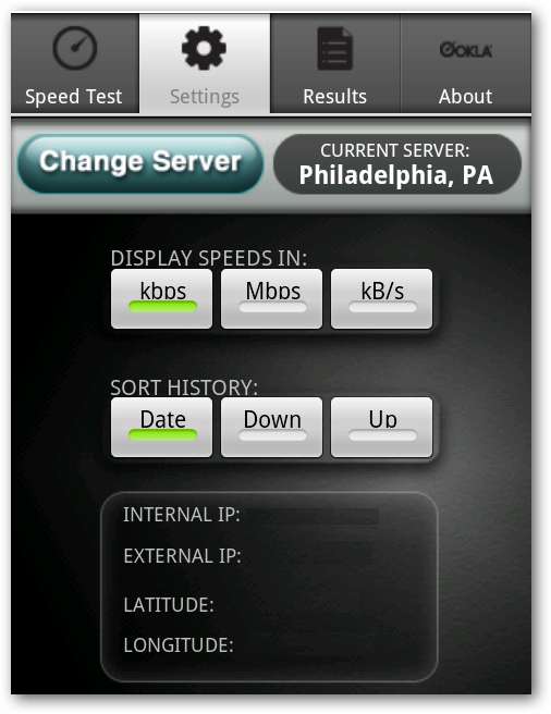 Tab Cài đặt cho phép bạn thay đổi cách hiển thị tốc độ, sắp xếp lịch sử và Địa chỉ IP cũng như Vĩ độ và Kinh độ. Bạn thậm chí có thể thay đổi máy chủ mà bạn sử dụng cho bài kiểm tra của mình.