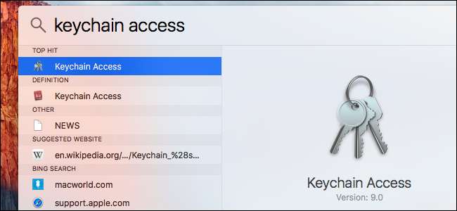 Để tìm mật khẩu Wi-Fi trên máy Mac của bạn, nhấn Command + Space để mở hộp thoại tìm kiếm Spotlight, nhập “Keychain Access” mà không có dấu ngoặc kép và nhấn Enter để khởi chạy ứng dụng Keychain Access.