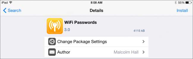 Mở cửa hàng Cydia và tìm kiếm Mật khẩu WiFi tinh chỉnh. Nhấn vào nút Install để cài đặt nó. Nó tương thích với iOS 6, 7, 8 và 9.
