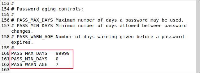 Khi tài khoản được tạo ra, một tập hợp các giá trị mặc định được sử dụng cho mật khẩu. Bạn có thể xác định những gì giá trị mặc định là dành cho những ngày tối thiểu, tối đa, và cảnh báo. Những sau đó được tổ chức tại một tập tin gọi là “/etc/login.defs.”