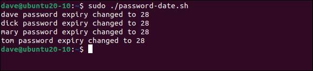#! / Bin / bash reset_days = 28 cho tên người dùng trong $ (ls / home) làm sudo chage $ username -M $ reset_days echo $ password username hết hạn đổi thành $ reset_days thực hiện