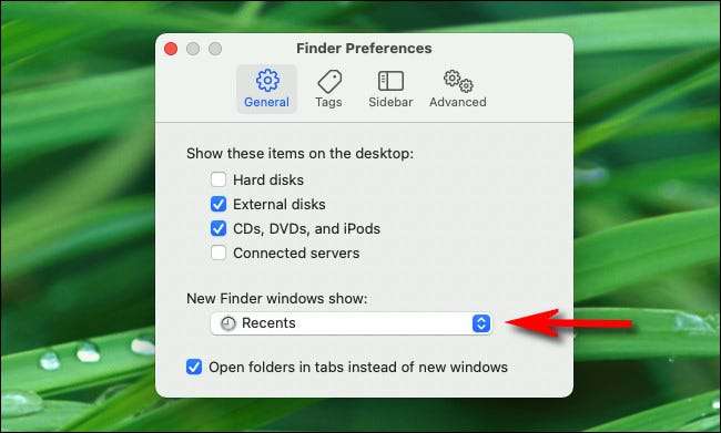 Khi sở thích Finder mở, hãy nhấp vào tab "Chung", sau đó nhấp vào menu có nhãn "Trình tìm mới Windows Show."