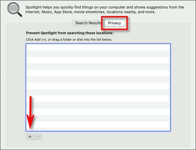 Trong chế độ chú ý, nhấp vào tab "Quyền riêng tư" và bạn sẽ thấy một danh sách có nhãn "ngăn chặn ánh mắt tìm kiếm các vị trí này". Bằng cách sử dụng điều này, chúng ta có thể ngăn chặn điểm nổi bật của các tệp trong thư mục "Recents". Nhấp vào nút "cộng" ("+") để thêm một thư mục.