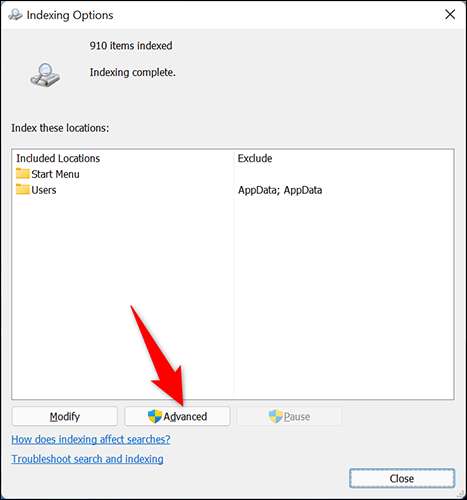 Trên cửa sổ "Tùy chọn lập chỉ mục" mở ra, nhấp vào nút "Nâng cao".