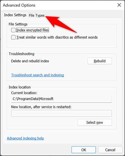 Sau đó, ở trên cùng, nhấp vào tab "Cài đặt chỉ mục".