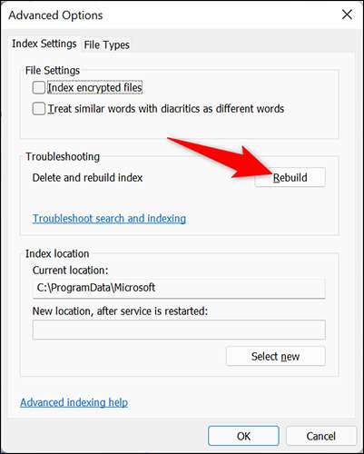 Trên tab "Cài đặt chỉ mục", bên cạnh "Xóa và xây dựng lại chỉ mục", nhấp vào "Rebuild." Cái này tạo một chỉ mục tìm kiếm mới , mà, khi hoàn tất, sẽ xóa loại tệp đã chọn của bạn.